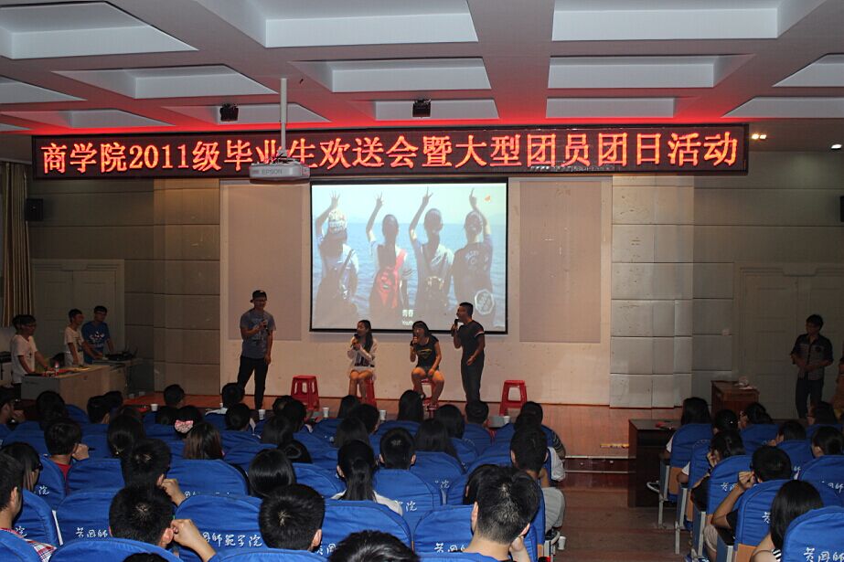 2015年5月28日晚,商学院2011级毕业生欢送会暨大型团会顺利举行。商学院党总支书记李月华、商学院院长刘汉成、商学院党总支副书记余晚霞、大四班主任和辅导员出席了此次活动。其他各院学生代表也送来祝福。
