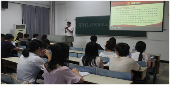 主题党日活动共分两大部分进行,首先,在认真完成“缴纳党费、奏唱国歌、重温入党誓词、诵读党章、学习系列讲话”五项规定动作后,学生党支部组织委员陶依同志就党“组织关系转接”问题,采用图文等多种方式直观地向同学介绍面临毕业党组织关系转接处理方式,并细致入微的针对各党员提出的问题进行讲解答疑。通过党课形式帮助同学们对于党的知识有了更为深入的学习了解。
