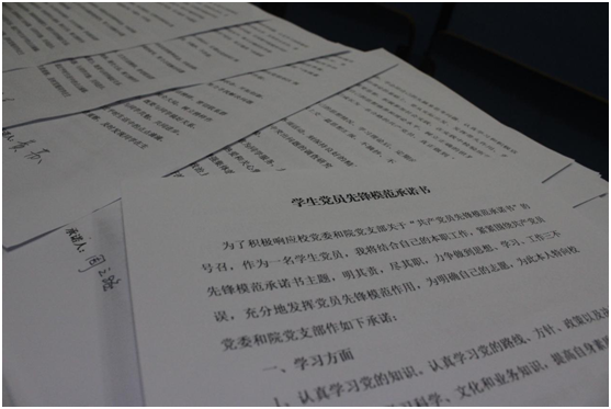 通过举办党员先锋模范承诺书签名仪式,让学生党员进一步角色定位,发挥好先锋模范作用,率上率下,不忘初心,扎实工作,身体力行地把党的方针政策落实到学习和班级工作中去。
