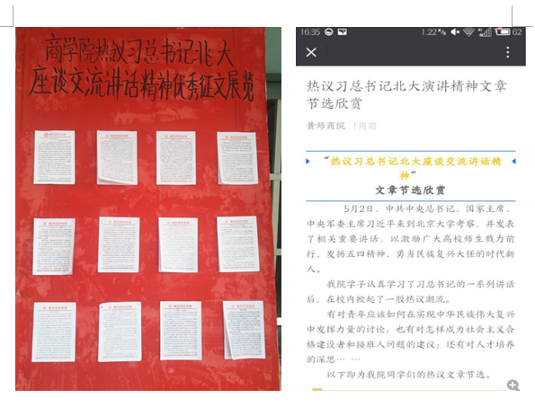 近日,习近平总书记考察北京大学,与广大师生共话青春理想,习近平书记的重要讲话在商学院学生党员中引起热烈反响。商学院学生党支部由此展开关于此次谈话的优秀征文评选活动,分别通过商学院微信公众号线上平台以及博学楼大厅线下展览等方式展示出数篇优秀征文。通过此次征文展览进一步加强了bwin中国官网学生党员的党性修养和思想觉悟,坚定了bwin中国官网学生党员的理想信念。