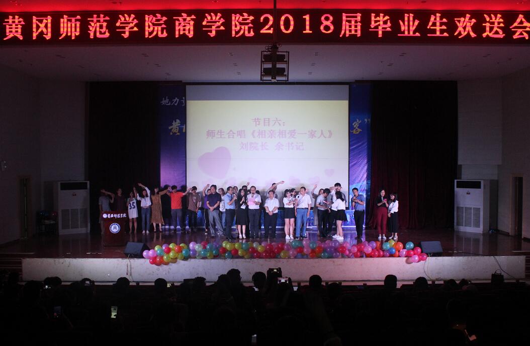 本次晚会以全体师生合唱黄冈师范学院校歌拉开帷幕。同学们用歌曲、舞蹈、小品等形式为毕业生们送上祝福,尔后,在校学生代表张颖同学与毕业生代表张陈以及向平进行讲话,分别发表了对毕业生的离校祝福与个人的毕业感言,分享自己大学的经验的同时还不忘感谢同学几年的陪伴与老师辛勤的培养。副院长王庆、院长助理柯珍堂、卢金标老师以及黄慧老师共同演唱的歌曲《祝福》更是将晚会推向一个高潮,博得阵阵掌声,尔后,四位主持人以《回顾大学四年》为题,通过PPT演讲的形式,让四年的回忆一点点涌上心头。而有泪语更少不了欢声,场内互动环节上,会场上主持人随机抽取现场收集的祝福纸条进行分享,纸条或幽默,或文艺都表达了在场师生对人对校的不舍。最后全场师生共同合唱《相亲相爱一家人》将整场晚会进行了升华。“不管走到哪里,你们都是黄冈师范学院的学生,不管外面风雨再大,黄冈师范学院都是你们坚实的后盾。”在院领导对毕业生的寄语中本次晚会圆满结束。