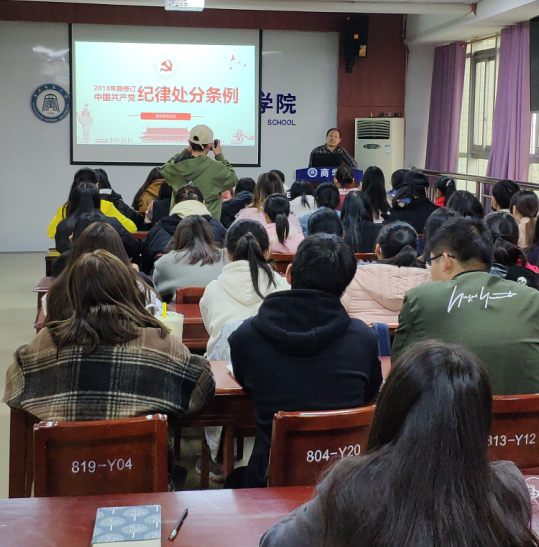 首先,袁书记介绍了出台中国共产党纪律处分条例的重大意义,表明我们应该自觉维护党章党规,严肃党的纪律,从严管党治党。紧接着,他深入浅出地讲解了条例修订后的八大亮点,即一个思想、两个坚决维护、三个重点、四个意识、五处纪法衔接、六个从严、七个“有之”、八种典型违纪行为。最后,袁书记从新版《条例》规定的“高压线”出发,结合商学院的实际情况,告诉青年学子应当传播正能量,言行一致,做新时代的大学生。