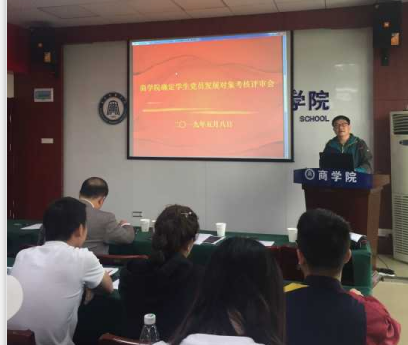 想工作及党风建设的重要性。随后,程惠老师宣读了《商学院学生党员发展量化积分考核办法》。紧接着,38名拟发展对象依次上台从入党动机、政治素质和现实表现三个方面作了自我评价。最后,袁建明副书记要求同学们首先要端正入党态度,其次要在学习、工作、生活中传递正能量,起到先锋模范带头作用。