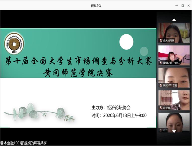 2020年6月13日上午9:00,第十届全国大学生市场调查与分析大赛黄冈师范学院决赛在腾讯会议举行。本次比赛由柯晶琳、李平衡、王阳、马迎霜四位老师担任评委,同时还邀请了商学院副院长柯珍堂老师、商学院学生会主席团唐骄,其他五大社团代表观看。