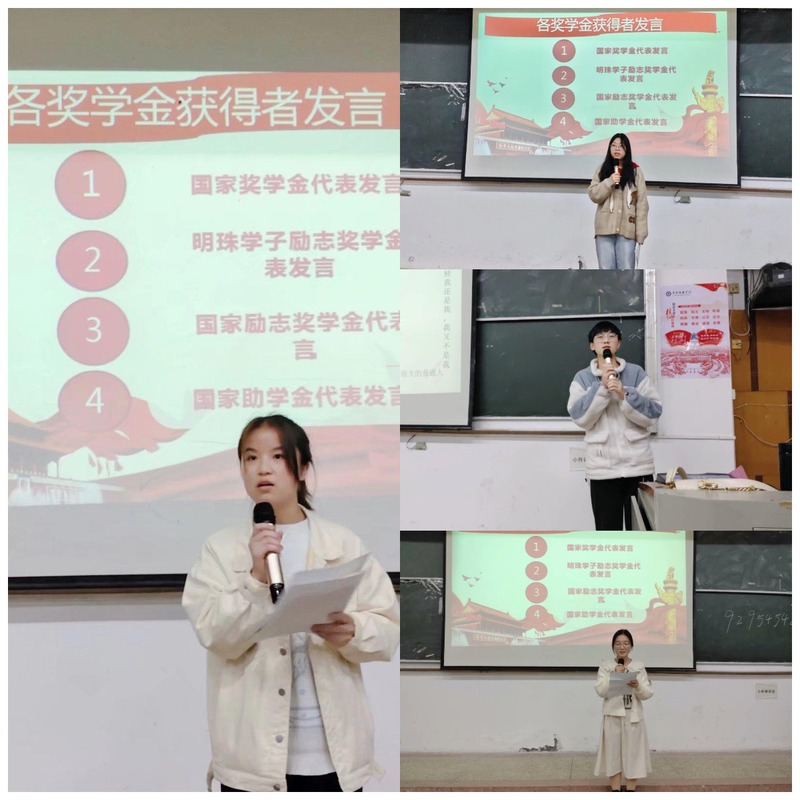 会议伊始,李娜老师饱含喜悦和赞扬之情,向大家介绍了参加此次会议的奖助学金获得者代表,拉开大会的帷幕。接着,国家奖学金获得者喻凤媛和李漫菁分别分享了她们在学习过程中的宝贵经验,全场学生受益匪浅。随后,明珠学子励志奖学金一等奖获得者赵建军上台,以幽默风趣的语言讲述了他的学习诀窍和给大家的考证建议,获得阵阵掌声。紧接着,国家励志奖学金代表郭梅上台发言,呼吁大家战胜迷茫:“雾的对面没有雾”,砥砺前行,唤起了全场同学追逐梦想的昂扬斗志。而后,国家助学金代表王婷君发言,她对国家所提供的帮助表示感谢,同时也告诉大家,我们应该做一个有理想有本领有担当的新时代黄师人,将温暖传递给更多的人。最后,各奖学金获得者与李娜老师合影,让这荣耀与自豪的一幕定格停留不褪色。