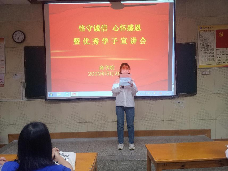 为深入贯彻党的教育方针,全面宣传党和国家各项学生资助政策和举措,落实立德树人根本任务,培养大学生诚实守信、感恩奉献、勇于担当的优秀品质,商学院于2022年5月26日晚上7:00—8:30在力行楼209教室开展了“恪守诚信心怀感恩”暨优秀学子宣讲会。辅导员何秀平老师、2020届和2021届受资助学生以及优秀毕业学子参加了本次活动。