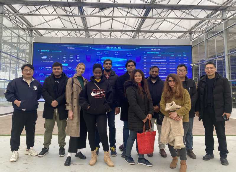 叶路洲自然条件独特、交通便利,一直是武汉都市圈的“后花园”,“菜篮子”。现代蔬菜种植示范园位于四面环水的叶路洲上。行驶在大堤上,远远就能看见一排排钢构蔬菜大棚错落有致、整齐划一、连绵不断。走进示范园的玻璃连栋温室展示区,首先映入眼帘的是一块巨大的电子屏幕,上面动态显示着园区的天气情况、园区建设情况,农作物数量、棚内的空气温度、湿度、光照强度以及各类蔬菜水果的收购价格等详细数据。在工作人员的带领下,bwin中国官网外籍师生认真听取了园区位置、建设情况、农作物生产情况的介绍。