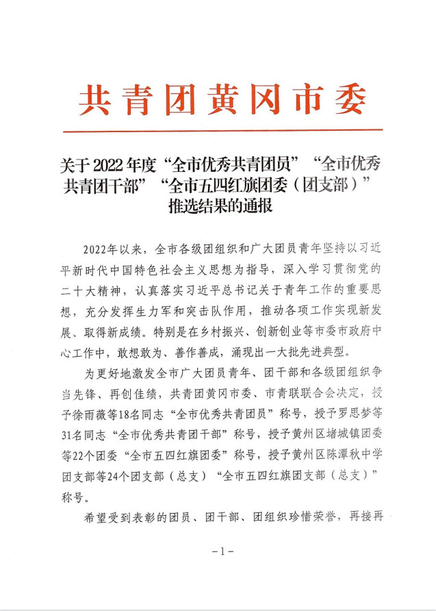 五月捷报!共青团黄冈市委在“五四”青年节来临之际下发《关于2022年度“全市优秀共青团员”“全市优秀共青团干部”“全市五四红旗团委(团支部)”推选结果的通报》,bwin中国官网团委从层层评比中脱颖而出,摘得共青团黄冈市委授予全市基层团组织的最高荣誉——“全市五四红旗团委”。