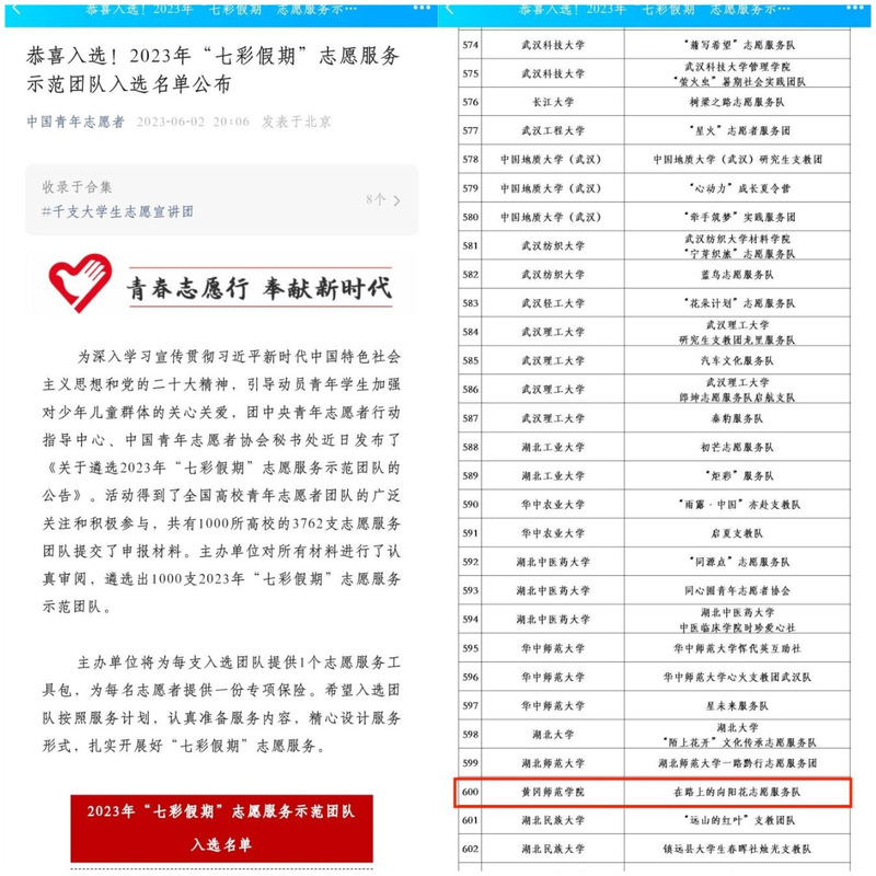 六月捷报!孟夏之日,万物并秀,一路向阳。在bwin中国官网党委和校团委的正确领导和悉心关怀下,bwin中国官网团委“在路上的向阳花”社会实践志愿服务队在1000所高校、3762支队伍中脱颖而出,成功被团中央青年志愿者行动指导中心、中国青年志愿者协会评为2023年“七彩假期”志愿服务示范团队。