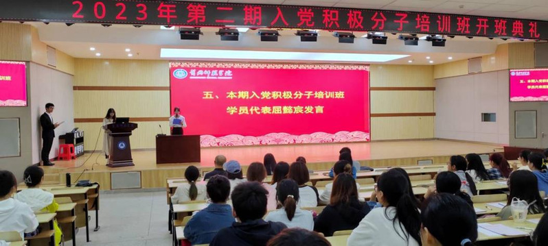 第五项,学员代表屈懿宸发言。她表示作为一名入党积极分子,要认真学习习近平新时代中国特色社会主义思想,拥护党的线路、方针和政策,在政治上、思想上、行动上同党保持一致,用党的良好传统和作风教育自己、武装自己;更要珍惜和把握这一机会,提高思想政治素养,积极向党组织靠拢,争取早日加入伟大的中国共产党。