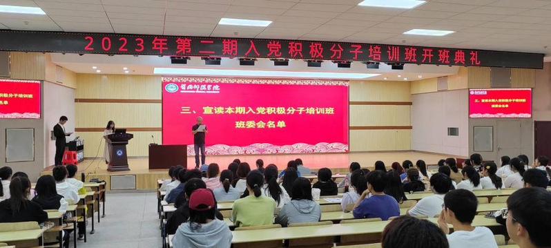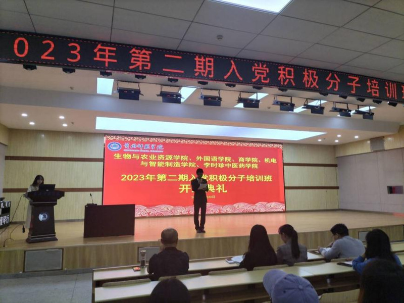 9月22日,商学院和生物与农业资源学院、外国语学院、机电与智能制造学院、李时珍中医药学院在北区报告厅联合举行2023年下半年入党积极分子培训班开班典礼。出席本次典礼的有生物与农业资源学院党委书记闵艳林、外国语学院学生第一党支部书记汪晖、商学院学生第四支部书记何秀平、李时珍中医药学院党务干事黄健。本次典礼由生物与农业资源学院学生第一党支部书记陈振中主持。