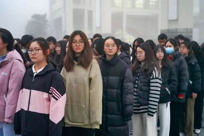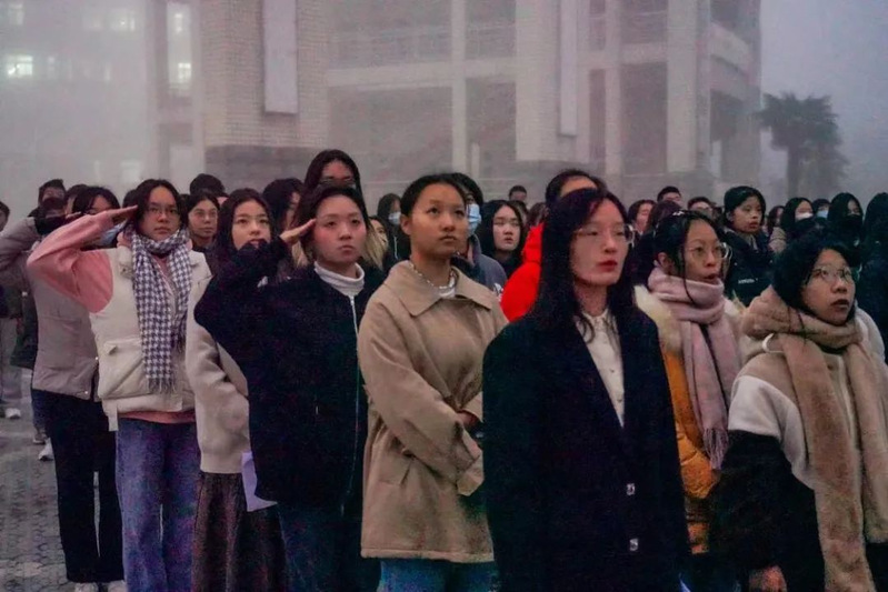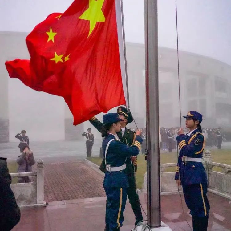 国旗飘扬,激发爱国力量;国歌雄壮,奏响奋进乐章。铿锵有力的步伐破开云雾,迎来了第一缕晨曦,国旗队队员迈着整齐划一的步伐入场,雄壮激昂的国歌声响起,升旗手奋力将国旗高高扬起,鲜艳的五星红旗在朝霞的辉映下冉冉升起。全体师生行注目礼。