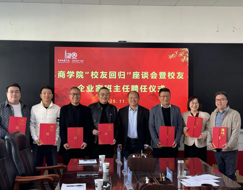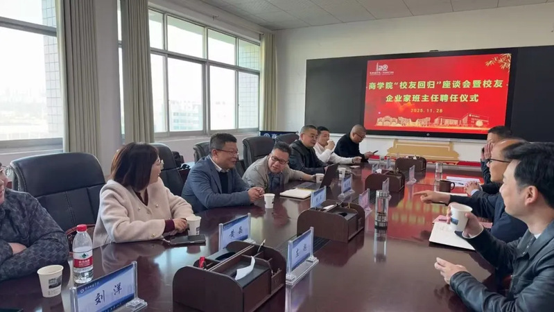 11月28日上午,在学校建校120周年的喜庆日子里,商学院在北校区致远楼719会议室隆重举行“校友回归”座谈会暨校友企业家班主任聘任仪式。返校校友、2025级新生班级校友企业家班主任,学院党委书记袁建明、院长王庆等出席活动,副院长周业旺主持仪式。学院党政办公室主任、学生事务办公室主任及新生班主任代表共同参加。